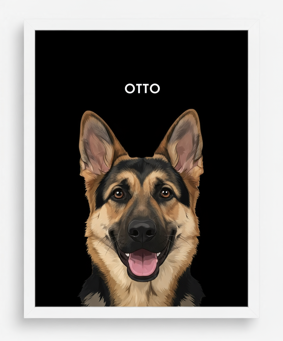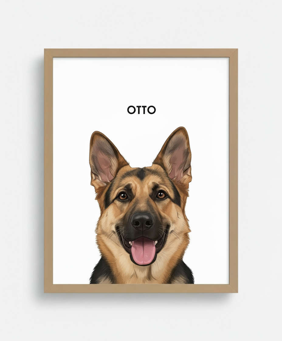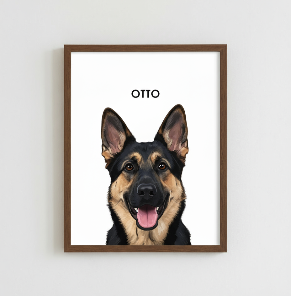 Ordering a pet portrait is easy! Simply select your preferred size and frame, upload a photo of your pet, and our artists at Marco y Huella will create a unique portrait capturing your furry friend’s personality.